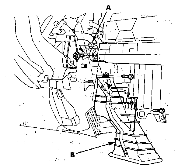 2. Remove the wire harness clip (A), the self-tapping screws, and the passenger's heater duct (B).