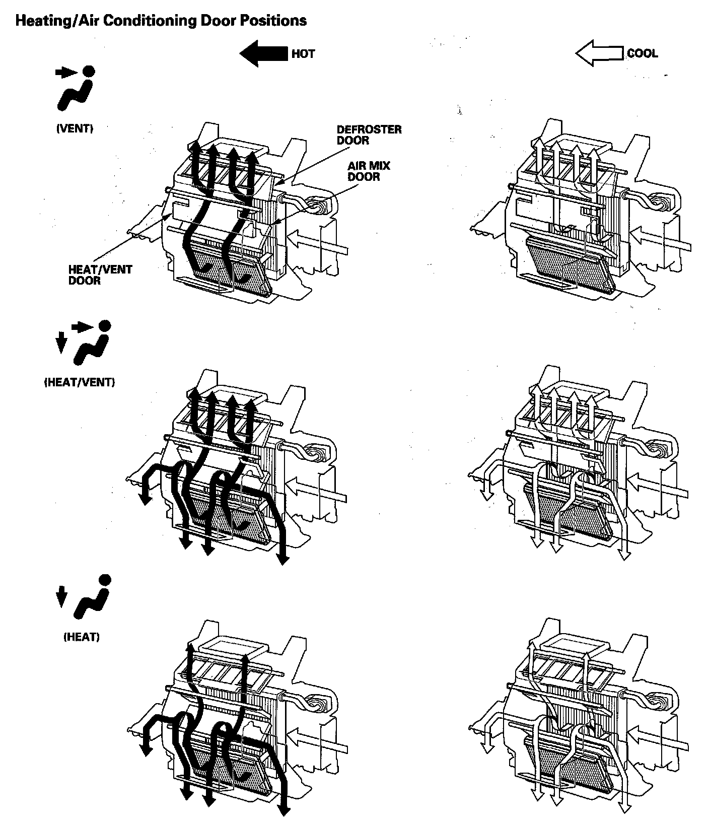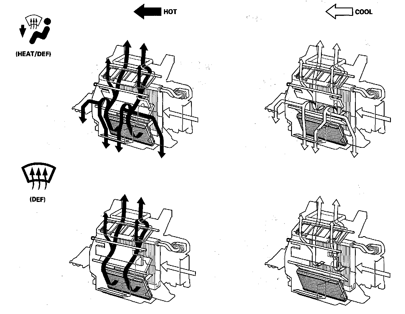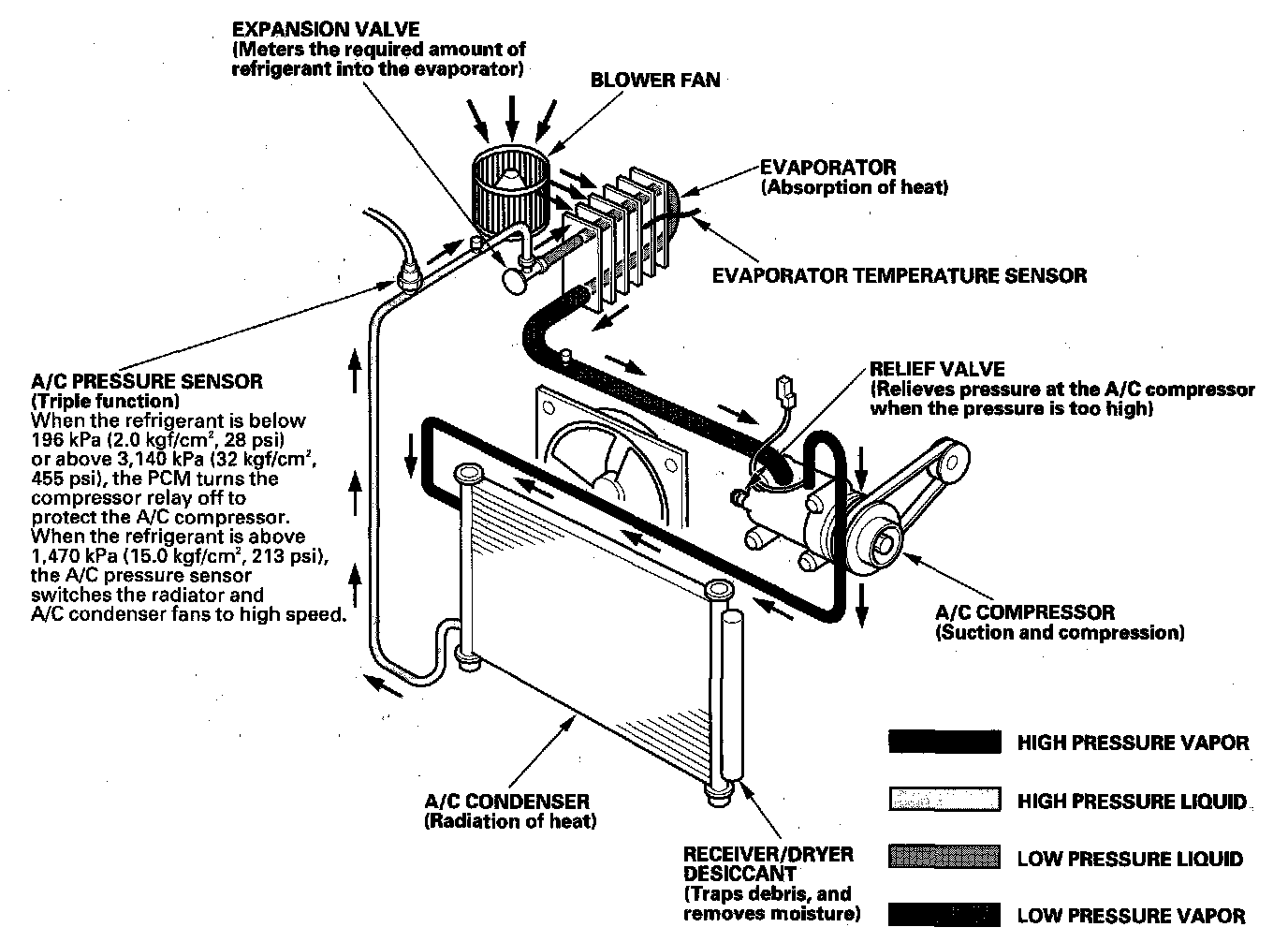System DescriptionThe air conditioning system removes heat from the passenger compartment by transferring heat from the ambient air to the evaporator. The evaporator cools the air with the refrigerant that is circulating through the evaporator. The refrigerant expands in the evaporator, and the evaporator becomes very cold and absorbs the heat from the ambient air. The blower fan pushes air across the evaporator where the heat is absorbed, and then it blows the cool air into the passenger compartment.