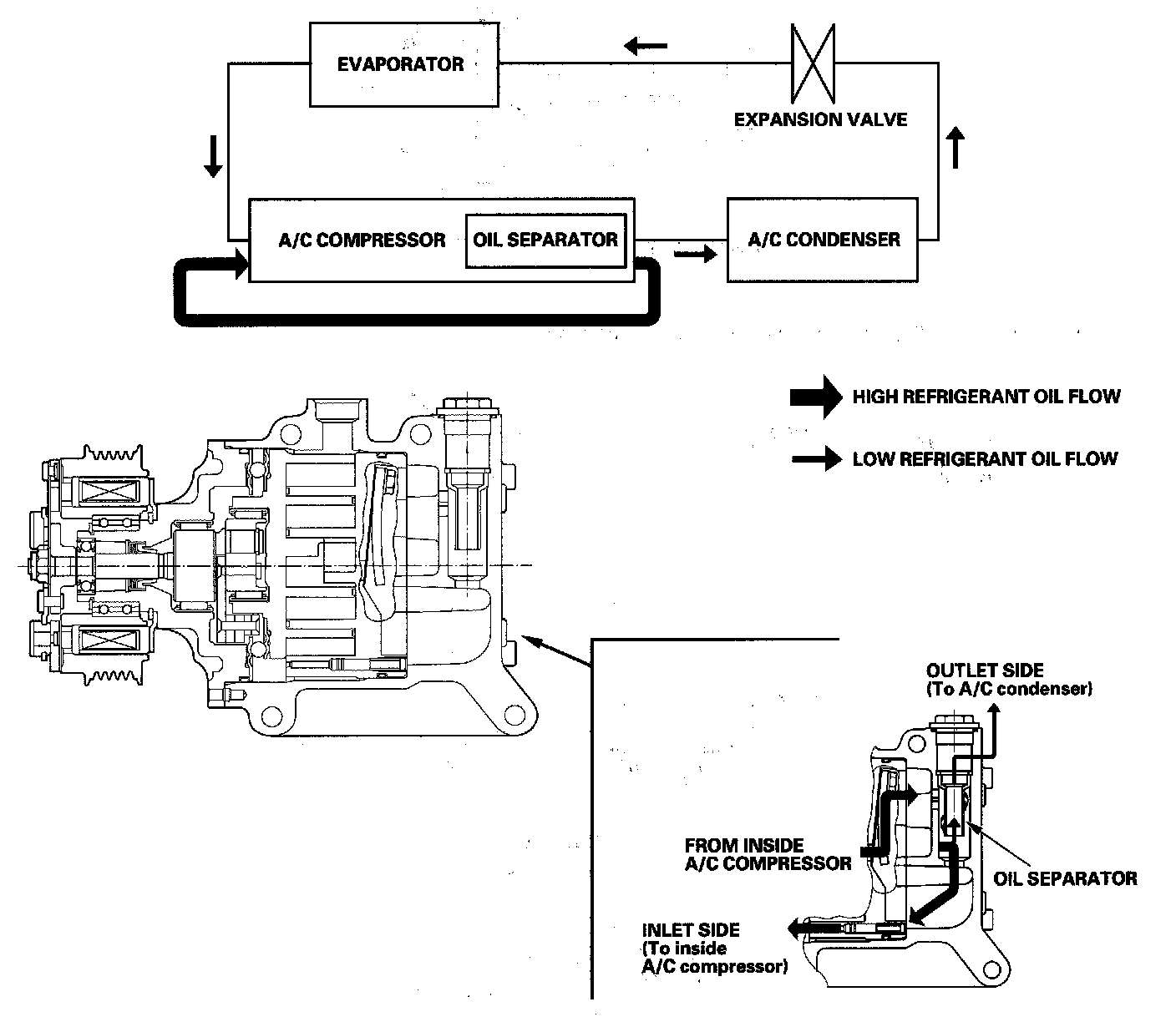 Oil emission from the A/C compressor to the A/C line is reduced by placing the oil separator in the A/C compressor. This results in a thinner oil film inside of the heat exchanger (A/C condenser and evaporator). Air conditioning efficiency is increased without sacrificing engine performance.