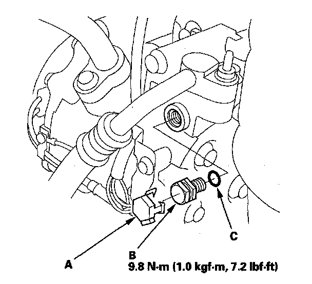 2. Remove the relief valve cover (A), the relief valve (B), and the O-ring (C). Plug the opening to keep foreign matter from entering the system and the A/C compressor oil from running out.