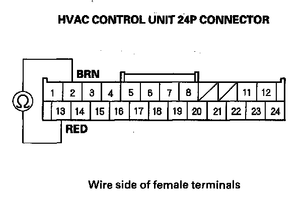 12. Measure the evaporator temperature sensor resistance between the HVAC control unit 24P connector No. 2 and No. 13 terminals.