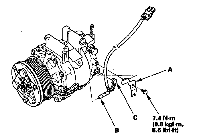 A/C Compressor Thermal Protector Replacement1. Remove the bolt and the holder (A). Disconnect the field coil connector (B), then remove the thermal protector (C).