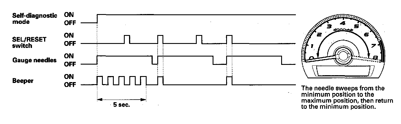 When entering the self-diagnostic mode, the tachometer, needle sweeps from the minimum position to maximum position, then returns to the minimum position.