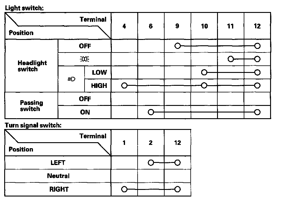 - If the terminals look OK, check for continuity between the terminals in each switch position according to the tables.