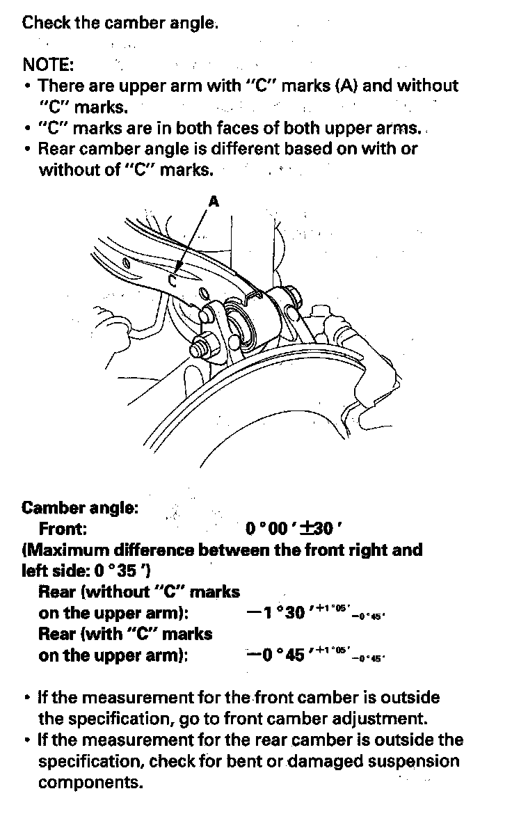 Wheel AlignmentThe suspension can be adjusted for front camber, front toe, and rear toe. However, each of these adjustments are related to each other. For example, when you adjust camber, the toe will change. Therefore, you must adjust the front wheel alignment whenever you adjust camber or toe.
