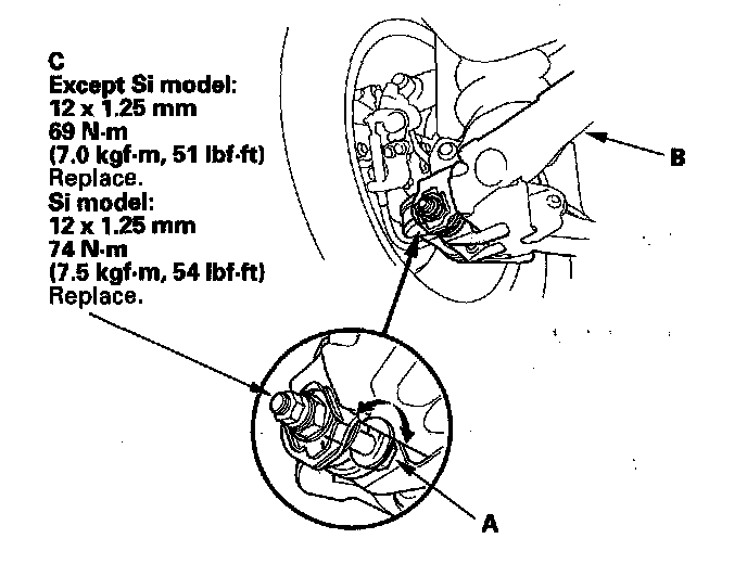 3. Hold the adjusting bolt (A) on the trailing arm (B), and remove the self-locking nut (C).
