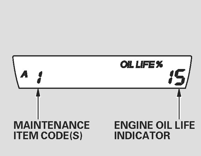 If the remaining engine oil life is 15 to 6 percent, the engine oil life indicator will display every time the ignition switch is turned to the ON (II) position. The maintenance minder indicator will also come on, and the maintenance item code(s) for other scheduled maintenance items needing service will be displayed next to the engine oil life indicator.
