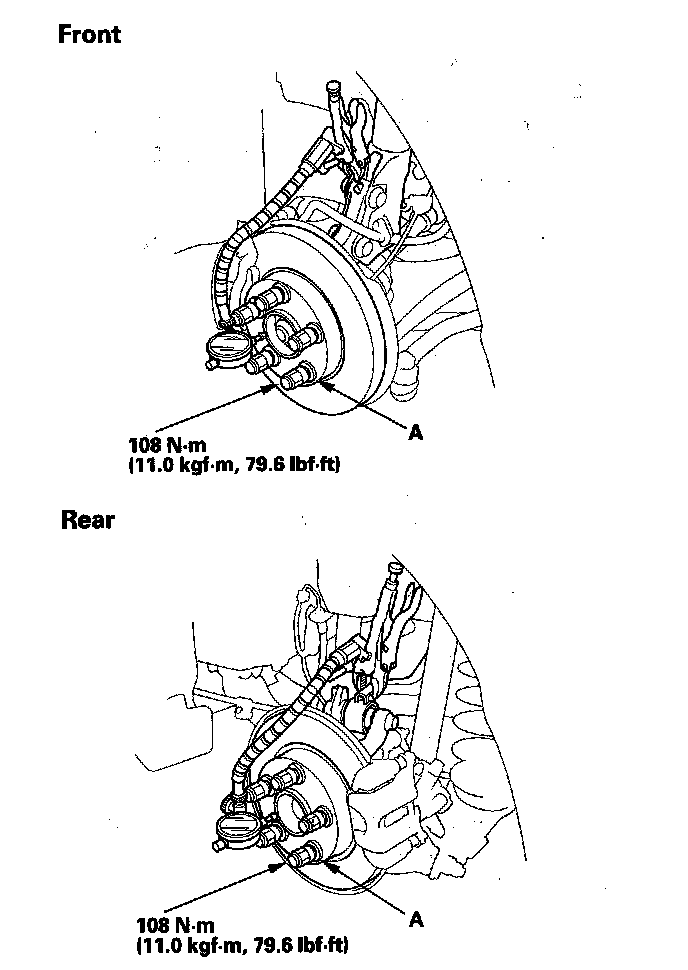 3. Install suitable flat washers (A) and the wheel nuts. Tighten the nuts to the specified torque to hold the brake disc or the, brake drum securely against the hub.