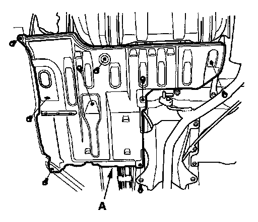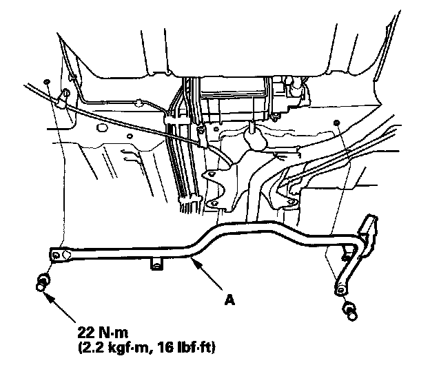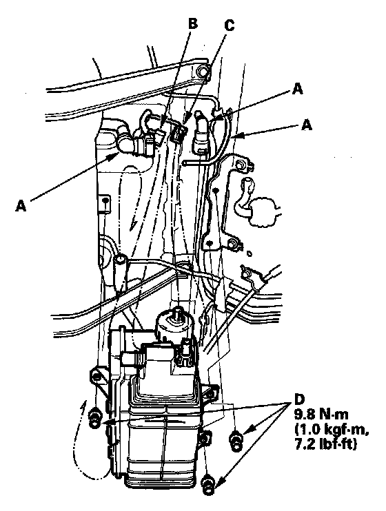 3. Remove the hoses (A), the FTP sensor connector (B), the EVAP canister vent shut valve connector (C), and the bolts (D).