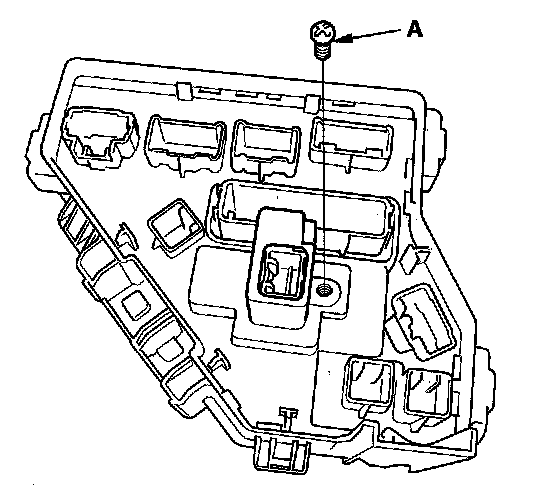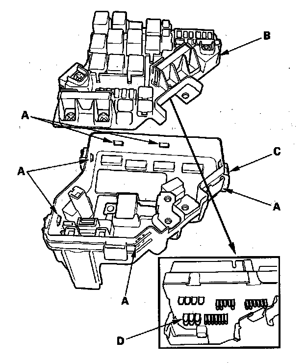 5. Turn the housing over again. Using two flat-tip screwdrivers, release the tabs (A), and pry up the fuse/relay box base (B) from the fuse/relay box housing (C).
