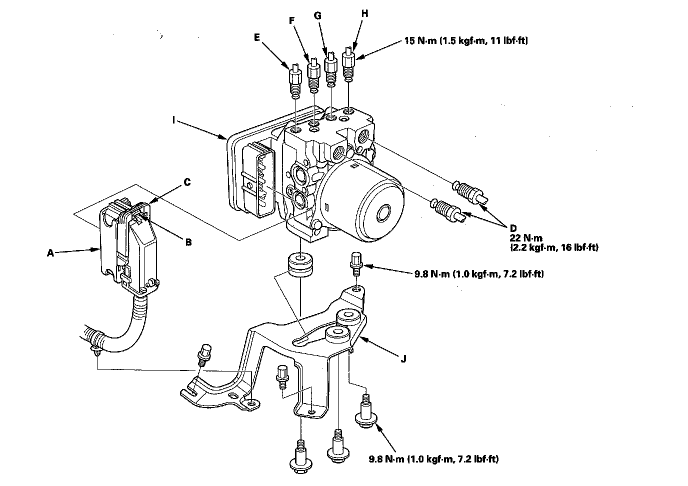 4. Remove the VSA modulator-control unit (I) with the bracket (J) from the body.