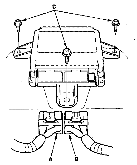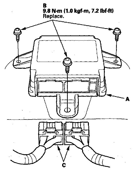 1. Install the SRS unit (A) with new TORX bolts (B), then connect the connectors (C) to the SRS unit-push them into position until they click.