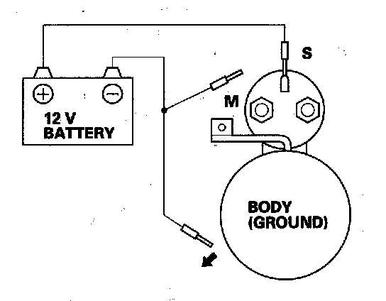 3. Connect the battery as shown. Make sure you disconnect the starter motor wire from the solenoid. If the starter pinion moves out, it is working properly.