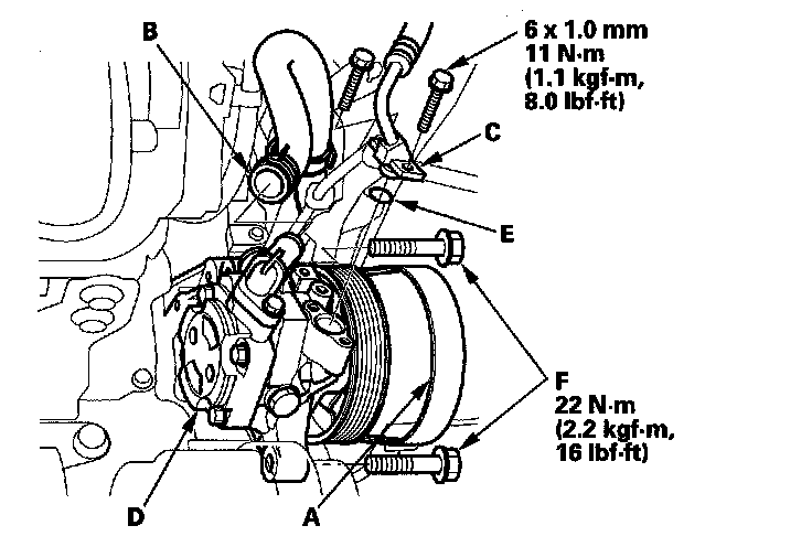 13. Remove the pump mounting bolts (F).