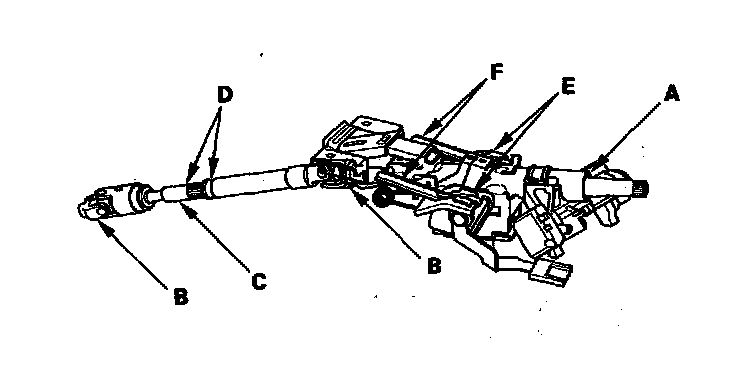 ^ Check the lower slide shaft (C) for smooth movement in and out. If the lower slide shaft is removed, slip it into the upper shaft by aligning the paint or stamped marks (D). If it sticks or binds, replace the steering column as an assembly.