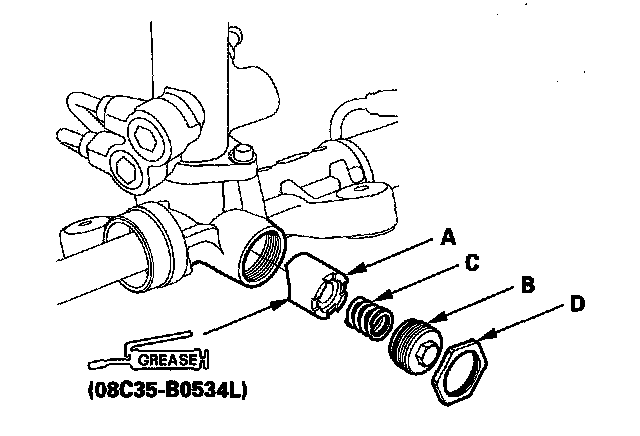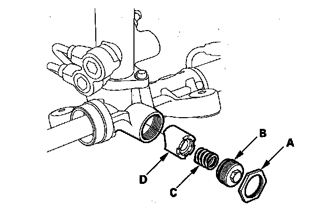 79. Remove the old sealant from the rack guide screw (B), then apply new sealant (Three Bond 1215 or Loctite 5699) to the middle of the threads. Install the spring (C), rack guide screw and locknut (D).