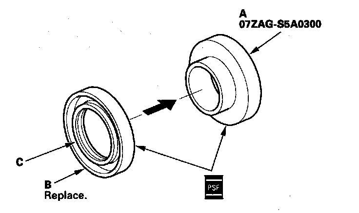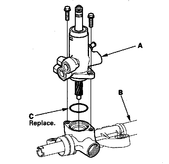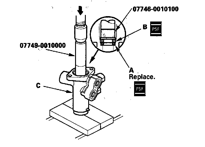 45. Apply power steering fluid to the seal ring lip of the new valve oil seal (A), then install the seal and bushing (B) in the valve housing (C) using a hydraulic press, driver, and attachment. Install the seal with its grooved side facing the tool.