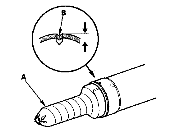 12. Drill a 4.0 mm (0.16 in.) diameter hole about 2.5 - 3.0 mm (0.10 - 0.12 in.) in depth in the staked point (B) on the cylinder. Do not allow metal shavings to enter the cylinder side on the gearbox housing. After removing the cylinder end, remove any burrs at the staked point.