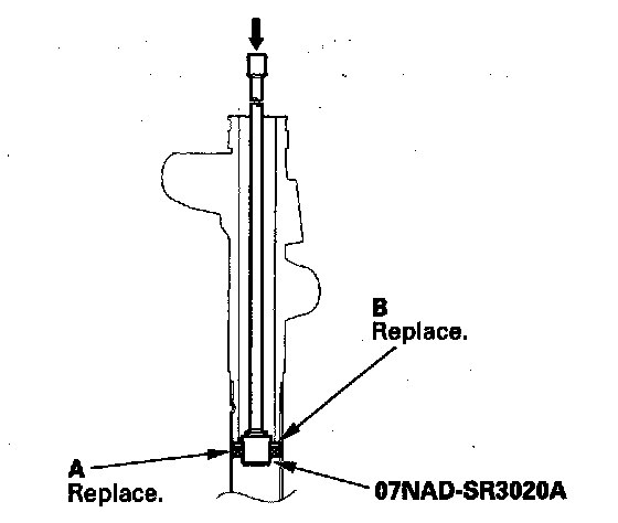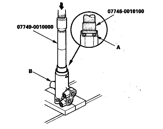 30. Remove the valve oil seal (A) and bushing (B) out of the valve housing using a hydraulic press and an appropriate size socket wrench.