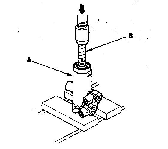 64. Install the cylinder end seal (B) into the bottom of the cylinder by pressing on the tool with a press. Do not push on the tool with excessive force as it may damage the cylinder end seal.