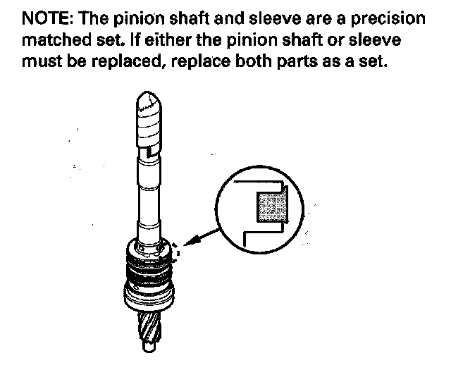 ^ The pinion shaft and sleeve are a precise fit; do not intermix old and new pinion shafts and sleeves.