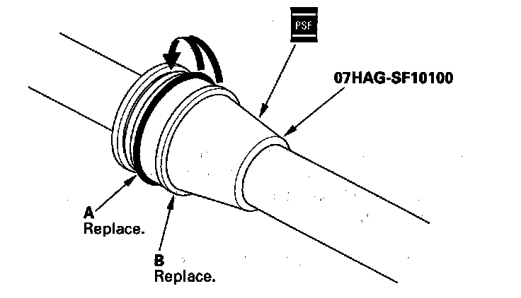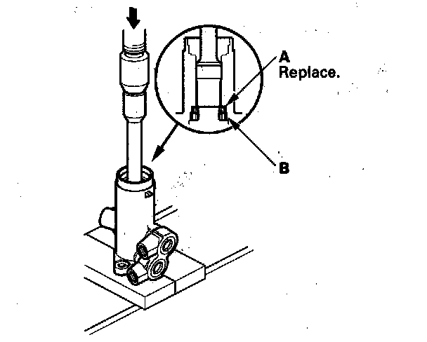 19. Carefully pry the piston seal ring (A) and O-ring (B) off the rack piston. Be careful not to damage the inside of the seal ring groove and piston edges when removing the seal ring.