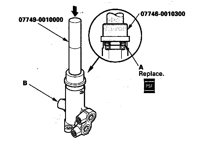 47. Apply power steering fluid to the seal ring lip of the new valve oil seal (A), then install the seal in the valve housing (B) using a hydraulic press, driver, and attachment. Install the seal with its grooved side facing the tool.