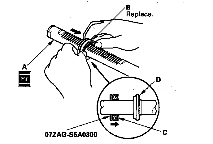 59. Install the cylinder end seal (B) onto the steering rack with its grooved side (C) toward the piston (D).