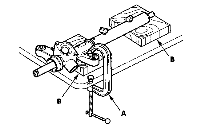 70. Hold the gearbox housing using a C-clamp (commercially available) (A) and wooden blocks (B). Do not clamp the cylinder part of the gearbox housing in the vise.