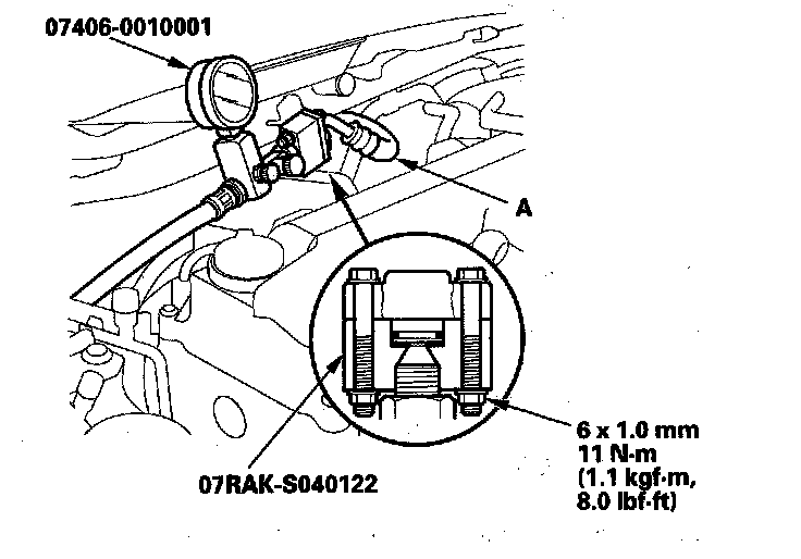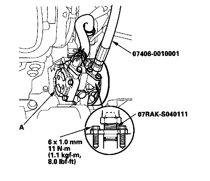 4. Disconnect the pump outlet hose, then install the P/S joint adapter (pump) on the pump (A). Take care so as not to spill the power steering fluid on the frame and other parts.