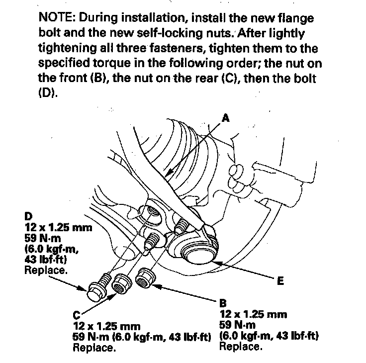 3. Disconnect the lower ball joint (E) from the lower arm.
