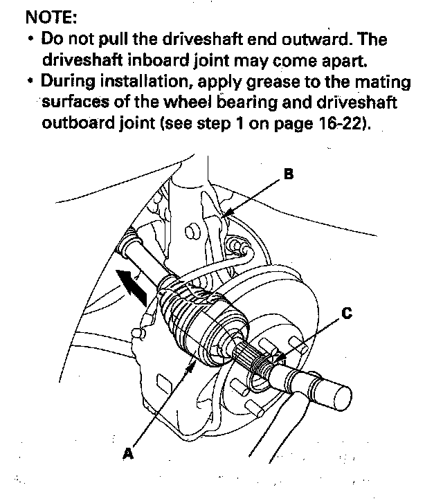 4. Remove the spindle nut, and remove the outboard joint (A) from the knuckle (B) by tapping the driveshaft end (C) with a soft face hammer while drawing the hub outward.