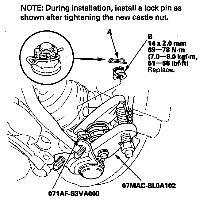 5. Remove the lock pin (A) from the lower ball joint, then remove the castle nut (B).