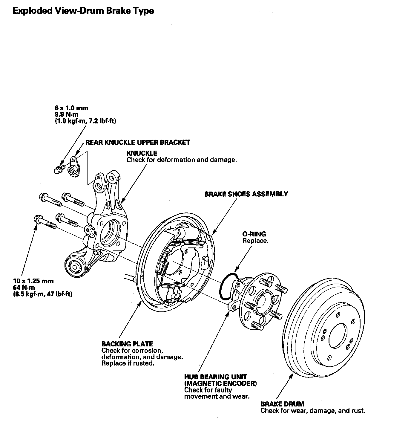 ^ Before installing the brake drum, clean the mating surfaces of the hub bearing unit and the inside of the brake drum.
