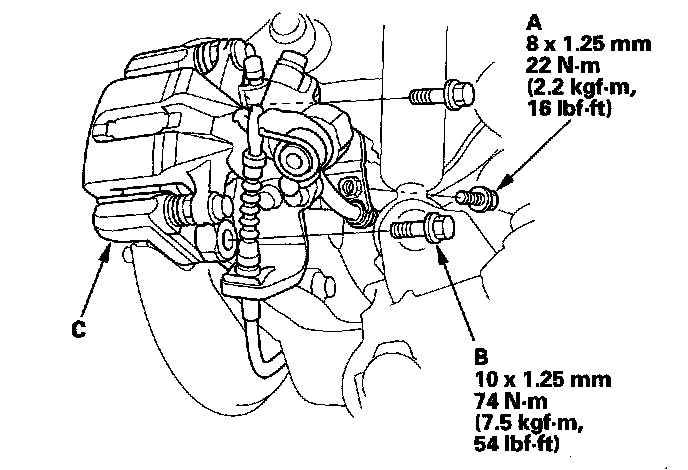 4. Remove the brake caliper bracket mounting bolts (B), then remove the caliper assembly (C) from the knuckle. To prevent damage to the caliper assembly or brake hose, use a short piece of wire to hang the caliper assembly from the undercarriage. Do not twist the brake hose excessively.