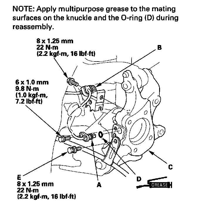 10. Install the knuckle in the reverse order of removal, and note these items: