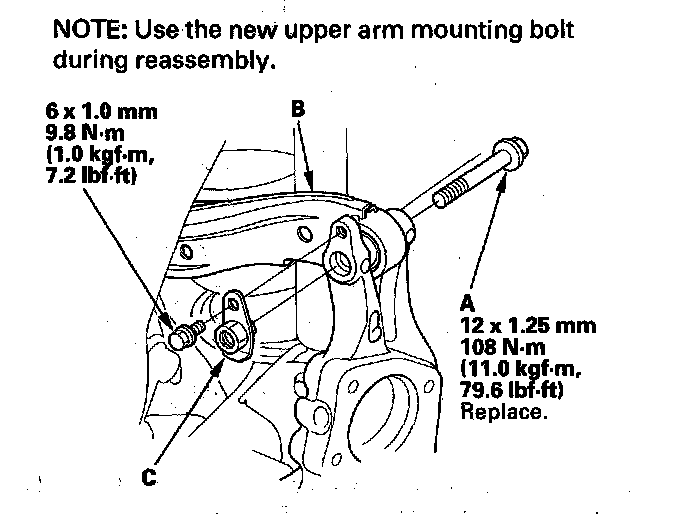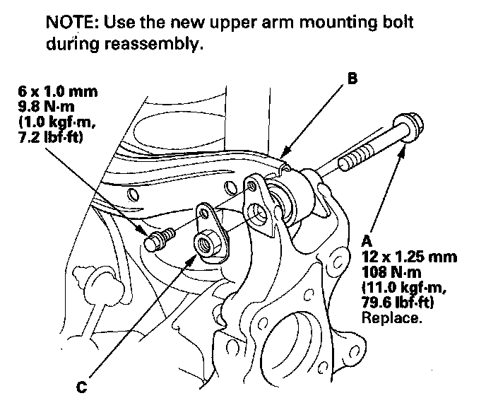 5. Remove the upper arm mounting bolt (A), and disconnect the upper arm (B) from the knuckle.