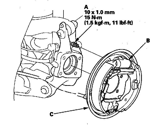 2. Disconnect the brake line (A) from the wheel cylinder (B). Remove the backing plate (C) with brake shoes assembly from the knuckle.