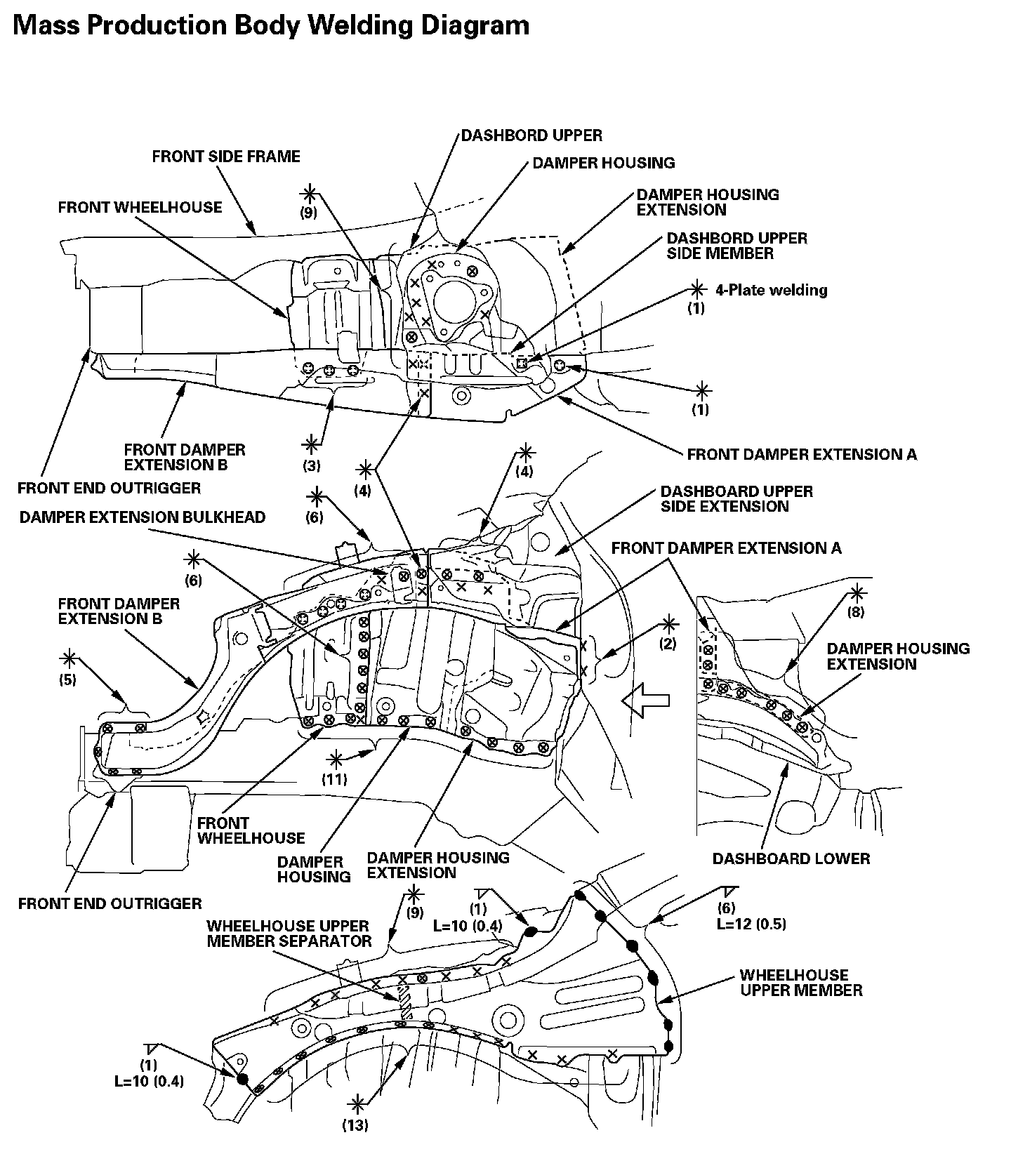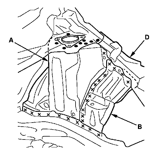 - Weld the damper housing (A), front wheelhouse (B), front damper extension A (C) and front damper extension B (D).