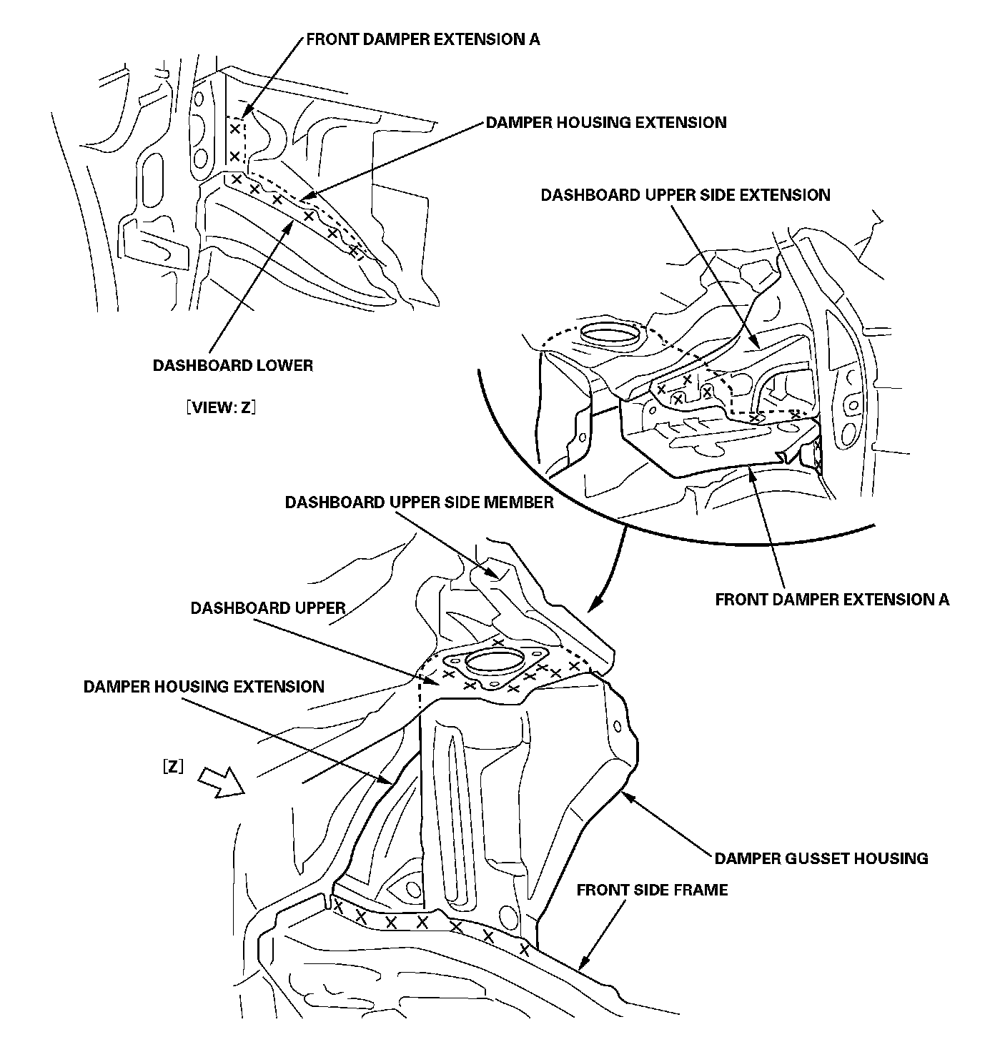 - If necessary, replace the damper housing, damper housing extension and front damper extension A as an assembly.