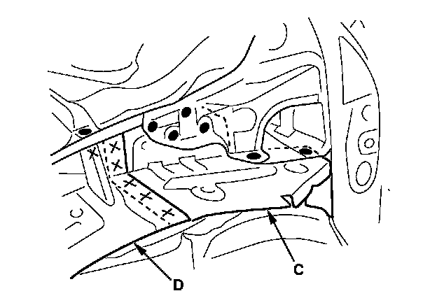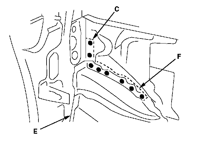 - From the passenger's side, plug weld the holes in the dashboard lower (E) and damper housing extension (F).