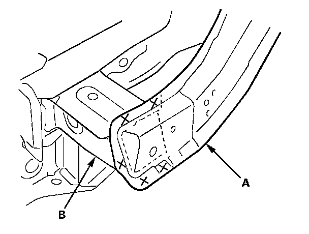 7. Weld the front damper extension B (A) and front end outrigger (B).