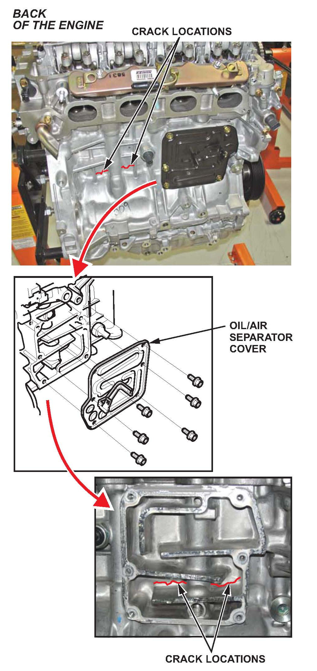 Look for coolant leaking from cracks in the block at the points shown below. On the back side of the engine, remove the oil/air separator cover so you can check beneath it. Pressure-test the cooling system if needed.