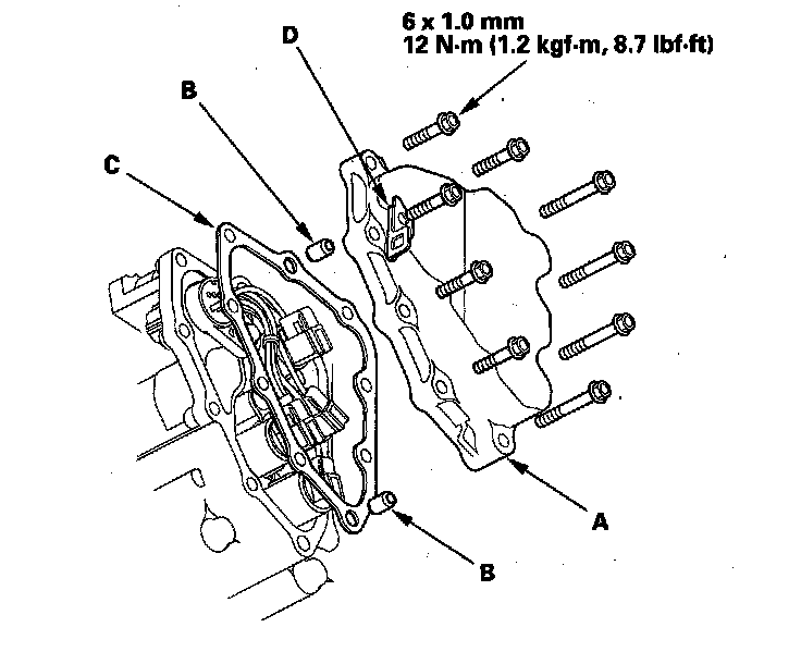 5. Remove the shift solenoid valve cover (A), the dowel pins (B), the gasket (C), and the harness clamp bracket (D).