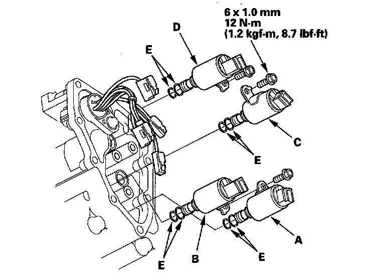 8. Install new O-rings (two O-rings per solenoid valve) (E) on the solenoid valve.
