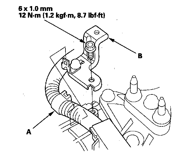 2. Remove the harness clamp (A) from its bracket, and remove the air cleaner housing bracket (B).