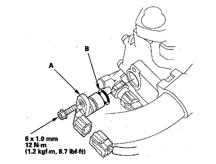 4. Install a new O-ring (B) on the new input shaft (mainshaft) speed sensor, then install the input shaft (mainshaft) speed sensor in the transmission housing.