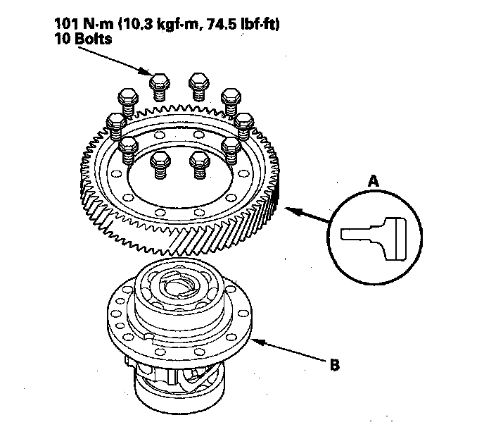 1. Remove the final driven gear (A) from the differential carrier (B). The final driven gear bolts have left-hand threads.