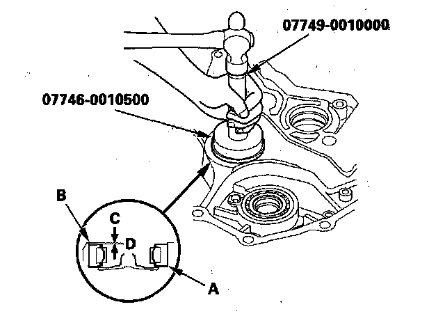 3. Install a new countershaft bearing B, in the housing using the driver and the 62 x 68 mm attachment; install the bearing outer race surface in height (C) of 0 - 0.03 mm (0 - 0.001 in.) above the housing surface (D). Do not install the bearing exceeding 0.03 mm (0.001 in.) high from housing surface.