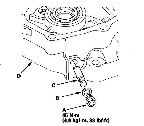 2. Remove the lubrication check valve (C) from the torque converter housing (D).